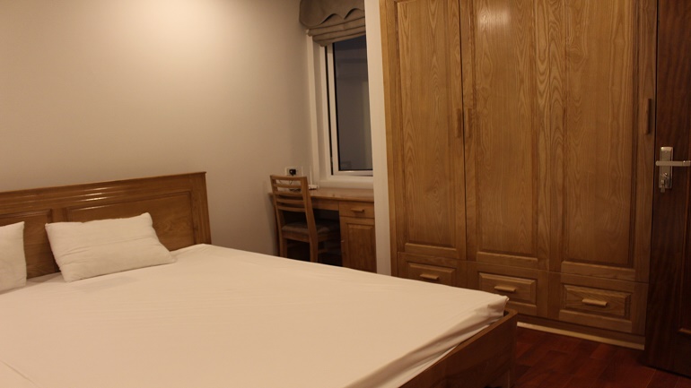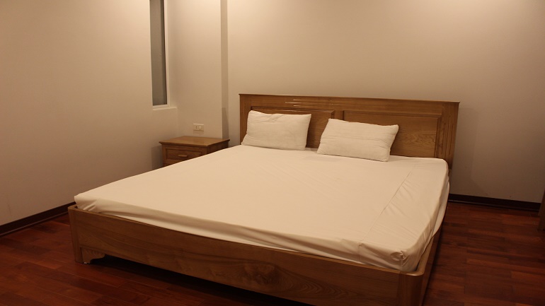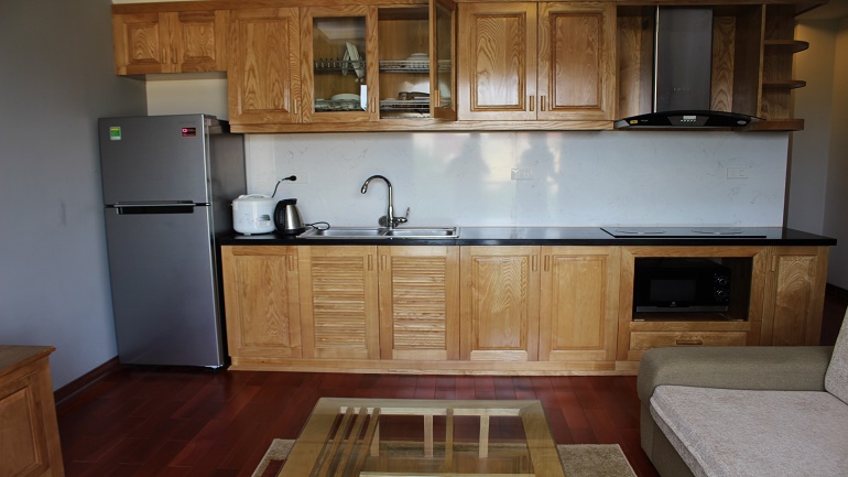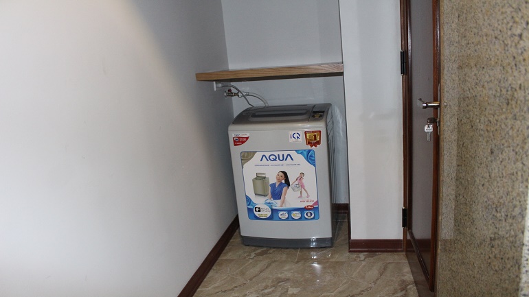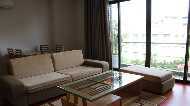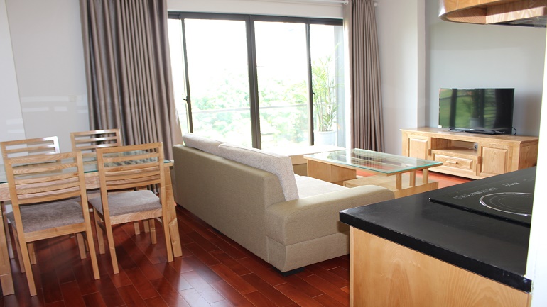 Apartment with balcony in Truc Bach lake for rent. This apartment is located in Lac Chinh street, Ba Dinh district. With using area about 50 sqm, the apartment has 1 bedroom, 1 bathroom, living-room and kitchen. In the living-room has a large glass window with a nice balcony. It is very bright and airy. The bathroom has a bathtub. This apartment is fully modern furnished: wooden floor, flat screen TV, sofa set, refrigerator, washing machine…